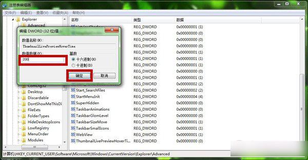 第四步、 我们双击打开“ThumbnailLivePreviewHoverTime”,并在“数值数据”输入“200”即2秒的意思,再单击“确定”,重启电脑即可。