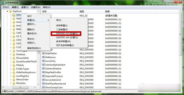 第二步、在“注册表编辑器”窗口, 依次找到“HKEY_CURRENT_USER\Software\Microsoft\Windows\CurrentVersion\Explorer\Advanced”。并右键点击“Advanced”项目,选择“新建”一个“DWORD(32-位)值(D)”。