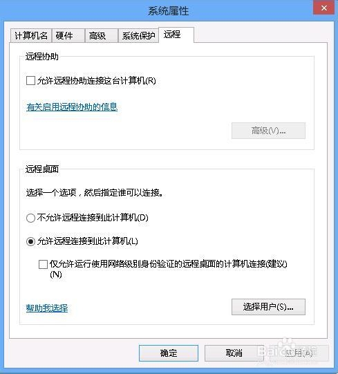 推荐设置(如下图),只需“允许远程连接到此计算机”即可。如果你再勾上“仅允许运行使用网络级别验证.....”那么在xp中,如果不进行一些特殊的设置(我的另一篇经验【xp与win8远程桌面的网络级别身份验证登陆】有介绍,在此不多提。),是无法连接到win8远程桌面的。