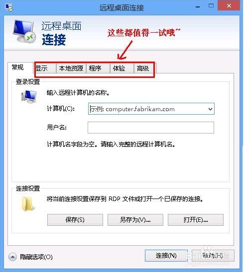 建议点击一下“显示选项”,进行更多的设置,例如你可以在“本地资源”标签下,把本地硬盘都连接到远程电脑之中,传送文件就很方便了。