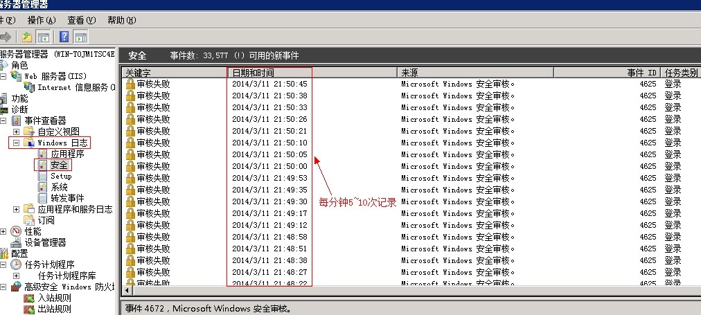 今天查看windows日志,在 -安全- 发现不断有消息刷出,显示 -审核失败- 事件ID为4624 的记录 每分钟大概刷新8条消息(如图)