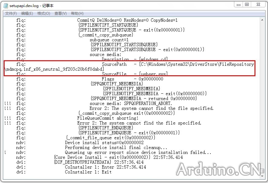 这个文件包含了有关即插即用设备和驱动程序安装的信息,当然它也记录你Arduino驱动安装失败的原因。