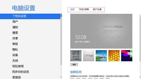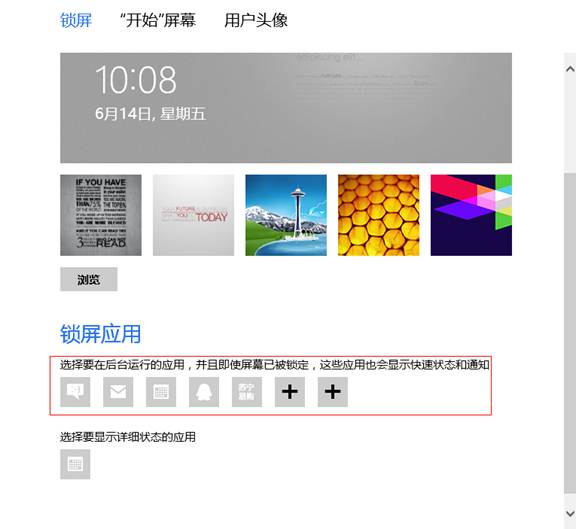 “开始屏幕”界面的个性化设置分为三部分,分别是锁屏、开始屏幕和用户头像。锁屏设置可以使用系统自带的壁纸,也可以添加自己喜欢的壁纸作为锁屏界面。此外,锁屏界面还支持应用消息的显示,比如收到新邮件,即使在锁屏界面下我们也可以看到通知提醒。
