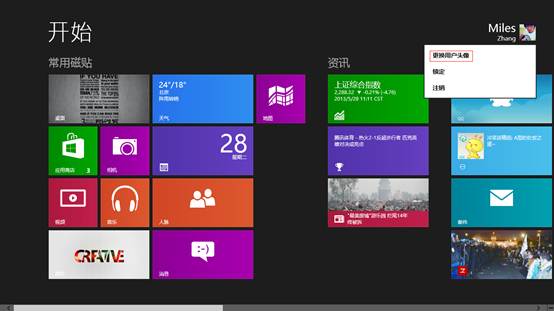 1) 在开始屏幕右上角点击用户头像,然后点击“更换用户头像”。