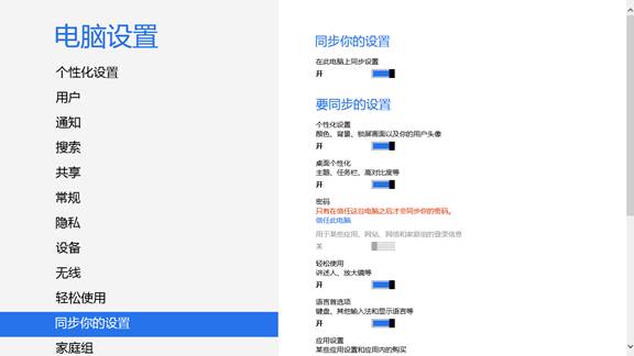 前面提到过如果使用微软账户登录系统,你就可以在多台电脑之间同步你的设置了,系统默认情况下是开启同步的。本地账户无法使用同步功能。