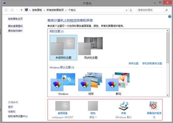 Windows 8传统桌面的个性化设置与Windows 7一样,可以直接使用系统自带的主题方案,同时也可以对壁纸、颜色、声音和屏保分别进行设置,并支持将自定义的主题保存以便随时使用。