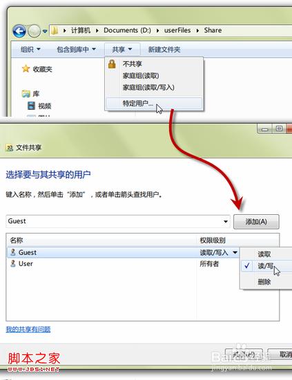 上述设置完毕,即可在Windows 7下开启某个文件夹的共享功能,使得Mac电脑可以读取甚至写入文件的目的。打开需要共享的文件夹——在窗口上方的“共享”下拉菜单中点击“特定用户…”——在弹出的选项窗总添加“Guest”,并将权限级别进行相应设置。