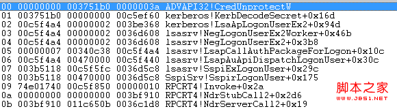 这些内容实际在 lsass 进程里面解密,断点 ADVAPI32!CredUnprotectW命中堆栈如下:
