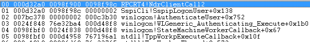 我们断点 winlogon!NdrClientCall2观察下【这里不 bp RPCRT4!NdrClientCall2主要是避免其他进程干 扰,因为 RPC 在系统中调用很频繁】,随便输入个密码,命中: