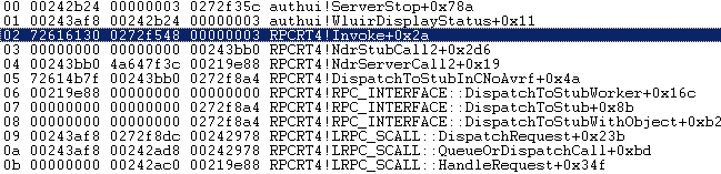 这里我们发现 winlogon 的确使用了 RPC 调用来执行进程交互,注意这个函数名是 WluiDisplayStatus,其 实很明确的告诉我们 winlogonUIDisplayStatus,那么该 RPC 最终在哪里被执行呢?很显然是在 authui.dll 下断点 RPCRT4!Invoke 命中,而后单步跑一下,如图: