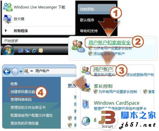 在 Windows Vista/ Windows 7 中你可以在密码没有忘记时先做个“密码重设盘”以备不时之需。在忘记密码时找出“密码重设盘”就可以重设密码了。下面以 Windows Vista 为例来看看具体的操作步骤, Windows 7 与此类似。