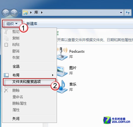 在Win7系统中,打开资源管理器,点击“组织”->“文件夹和搜索”选项。