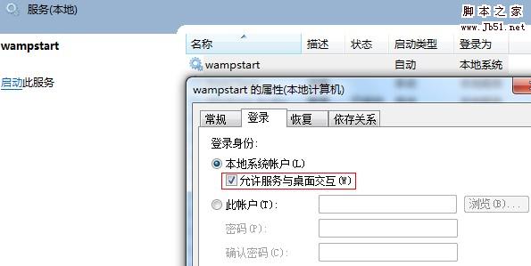 5、最后运行services.msc,找到之前设置的服务名称wampstart,打开属性-登录选项卡,勾选”允许服务与桌面交互”(一般你要运行的程序都是有界面的吧)。