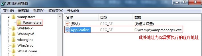 在Parameters项下新建一个”字符串值”(REG_SZ),名称为”Application”,数值数据里填写你要执行的程序完整路径。