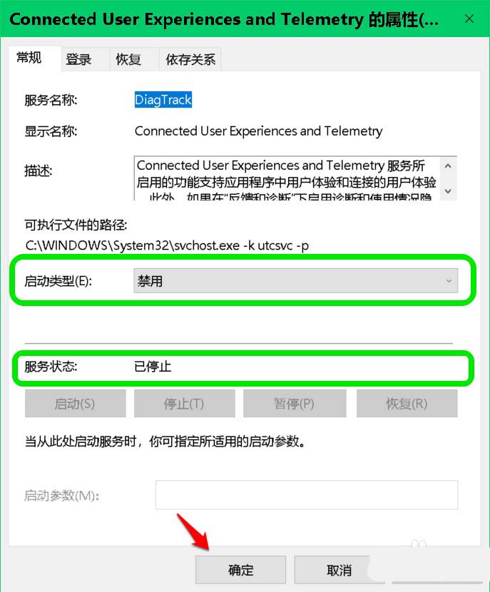 当 Connected User Experiences and Telemetry 服务的启动类型为【禁用】,服务状态为【已停止】时,我们点击:确定;