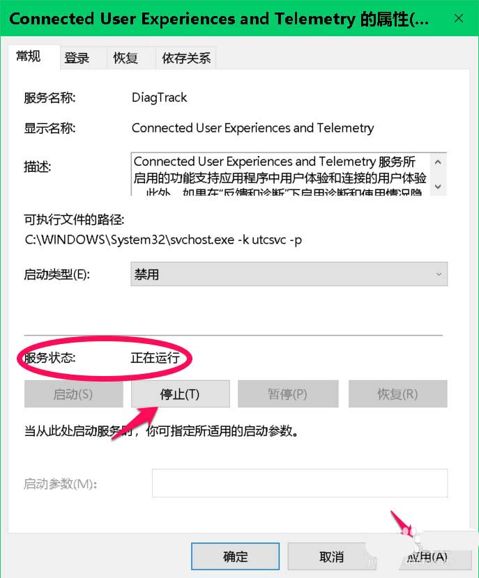 当启动类型为 禁用 时,我们先点击:应用,再点击 服务状态(正在运行) 栏的【停止】;