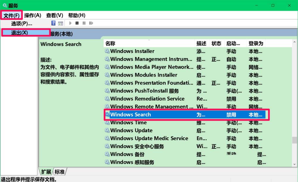 点击窗口左上角的【文件】,在下拉菜单中点击【退出】,退出本地服务窗口。