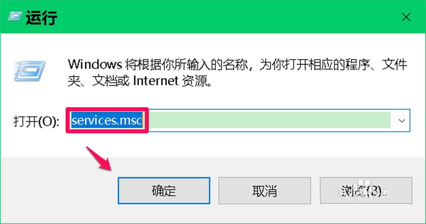 在运行对话框中输入:services.msc 命令,点击确定或者回车,打开本地服务窗口;