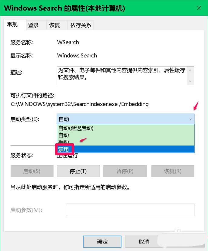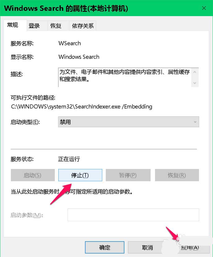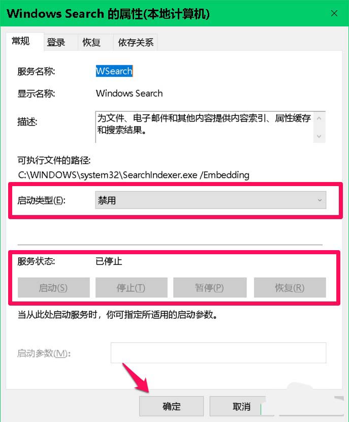 当 Windows Search 服务的启动类型为【禁用】,服务状态为【已停止】时,我们点击:确定;