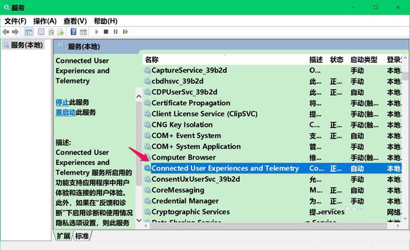 与上面关闭 Windows Search 服务一样,进入本地服务窗口,找到并左键双击 Connected User Experiences and Telemetry 服务;