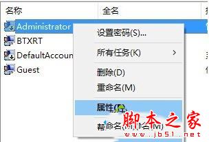 3、从右击找到“Administrator”账户并右键,从其右键菜单中选择“属性;
