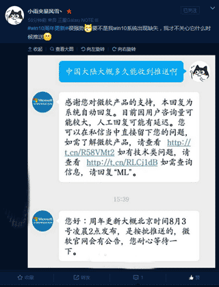 微博用户@小雨夹暴风雪、晒出了一张向微软官方咨询推送时间的对话截图,从截图中我们看到,微软官方客服的回复称,“周年更新大概北京时间8月3号凌晨2点发布,是按批推送的,微软官网会有公告,您耐心等待一下”。目前许多用户都十分关心具体何时才能够真正收到更新推送,包括唐娜姐在内的多位微软高管在不同场合已经表示,由于推送范围大,设备数量多,因此部分用户可能会延迟收到更新。