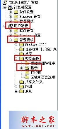 2、打开组策略编辑器,在左侧窗格中展开“用户配置”——“管理模板”——“控制面板”——“显示”;