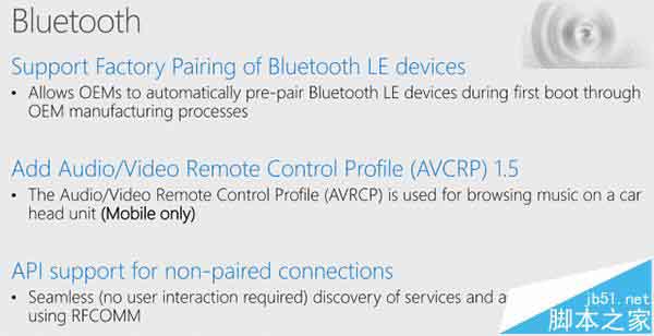 在微软WinHec 2016大会上,该公司公布了Win10 Mobile一周年更新版多项新功能,其中就包括蓝牙协议栈在该系统上的大升级。升级后的Win10手机蓝牙功能允许用户在蓝牙耳机和车载蓝牙播放设备上直接控制音乐播放。