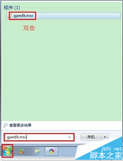 1、在【搜索栏】也就是左下角开始按钮处打开后的最下面,搜索:gpedit.msc,上面的现示区就出现了这个程序;
