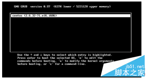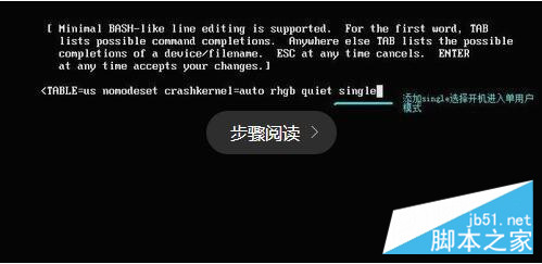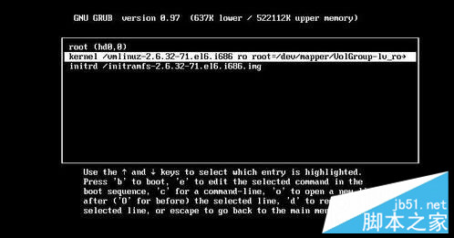 然后按e进入编辑页面 第二步: 进入如下页面后,通过键盘的上下方向键选择kernel那行,然后再按e进入编辑,在最末尾处加入参数single,使系统开机直接进入单用户模式,然后回车即保存编辑,回到了上一步的界面,点击键盘上的b即启动系统。