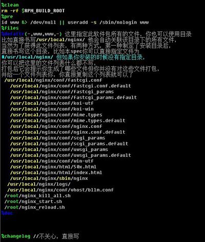 在SPECS目录执行 rpmbuild –bb nginx.spec ,同时记下来安装过程所提示需要安装的包。这个命令会按照我们的spec 指定的方式编译软件并且会在/root/rpmbuild/RPMS/x86_64/ 目录生成对应的rpm包,这个rpm包默认会记录在这个软件编译过程中会依赖于哪些其他软件,再次强调,如果你打包的时候和你安装的时候环境不一样,一定要注意在安装rpm之前手动安装好依赖,解决可能会出现的版本过低的问题。