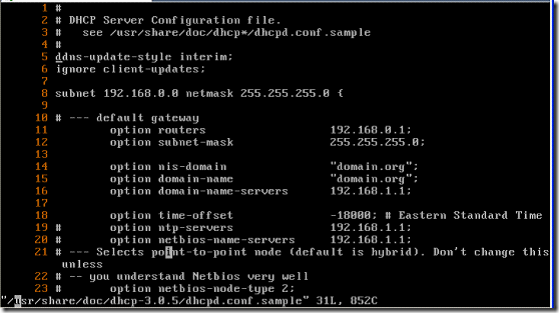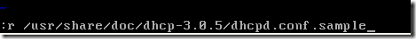 底行模式下   r  /usr/share/doc/dhcp-3.0.5/dhcp.conf.sample(读取dhcp.conf.sample文件)