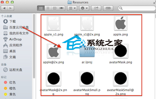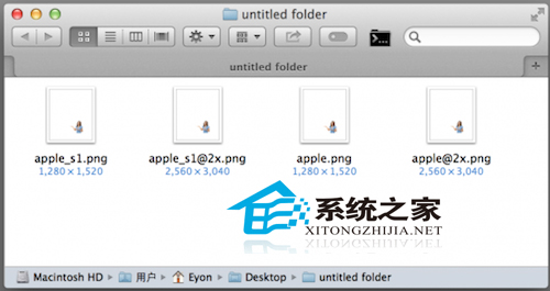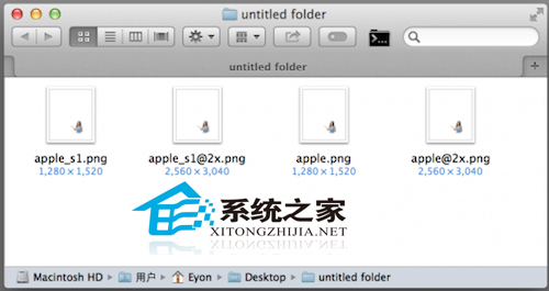 第二步:将得到的两张图片分别复制一份,得到4张图片。将两张小分辨率图片分别命名为 apple.png 和 apple_s1.png,将两张大分辨率图片分别命名为 apple@2x.png 和 apple_s1@2x.png。