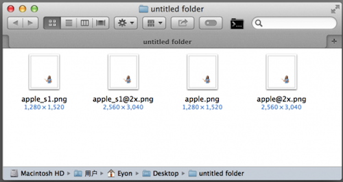 第二步:将得到的两张图片分别复制一份,得到4张图片。将两张小分辨率图片分别命名为 apple.png 和 apple_s1.png,将两张大分辨率图片分别命名为 apple@2x.png 和 apple_s1@2x.png。