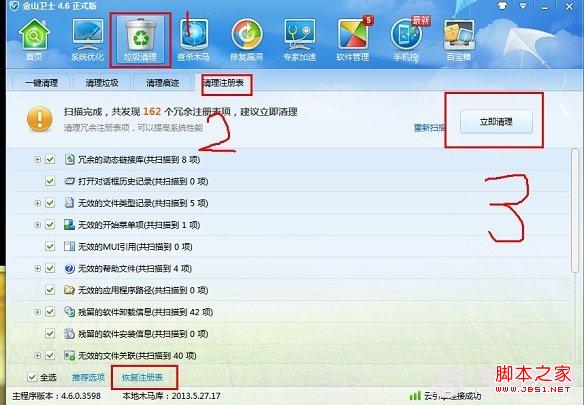 利用超级兔子、优化大师、安全卫士一系列的第三方软件清理,下面小编就以金山卫士为例,打开主界面,找到垃圾清理-清理注册表,开始扫描清理即可,金山卫士会自动把注册表备份,就不用我们在单独备份了,要是出了问题也容易恢复。