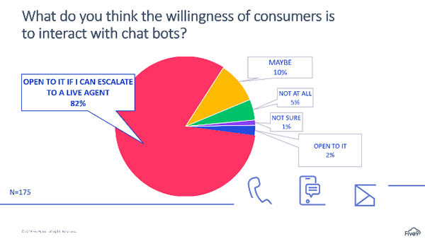 本月初,在与Five9首席执行官罗文·特罗洛普(Rowan Trollope)举行的网络研讨会上,我有机会就此问题与联络中心利益相关者进行了交流。如下图所示,我们请网络研讨会参与者报告消费者与聊天机器人进行交互的意愿。82%的受访者认为,如果消费者可以升级为实时座席,他们愿意与聊天机器人进行交互。