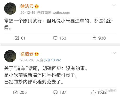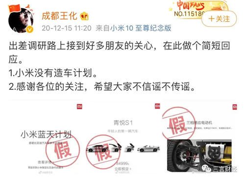 而有关小米造车传闻早已有之,2020年12月15日小米公关部副总经理王化以及小米集团总办副主任徐洁云曾辟谣,否认小米要造车。王化当时称,小米没有造车计划;徐洁云则连发两条微博否认造车,他表示“但凡说小米要造车的,都是假新闻”、“关于造车话题,明确回应:没有的事”。