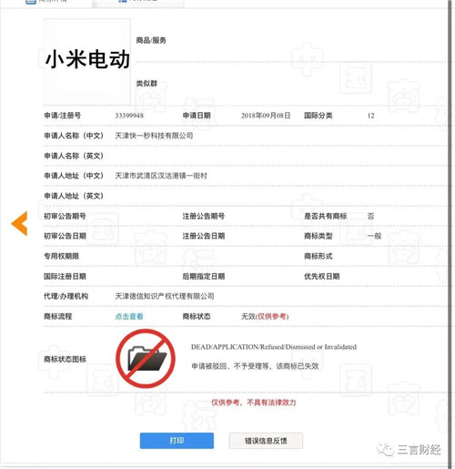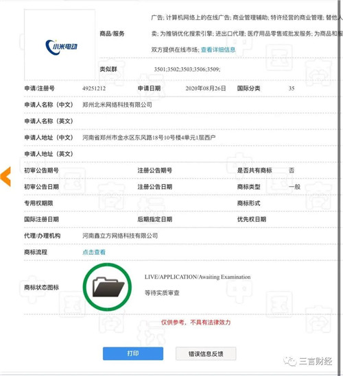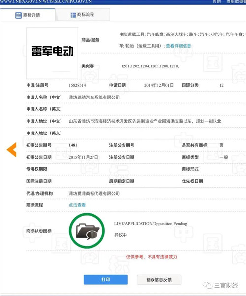 不过,三言财经发现目前早已有人注册了“小米造车”相关概念的商标。例如有人曾申请“雷军电动”商标。该商标申请日期为2014年12月1日,申请人系潍坊瑞驰汽车系统有限公司,商标状态为异议中。
