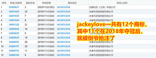 而且根据查出来的申请数量,网友们愕然发现jackeylove这个ID,从2018年开始,一共有12个商标申请,其中有11个在2018年IG夺冠以后,就被倒爷给抢注了的。 对于倒爷抢注JKL商标,这个是没有办法,合法合规。那么现在滔搏母公司注册JKL商标的话,会对阿水以后的职业生涯产生什么样的影响呢?