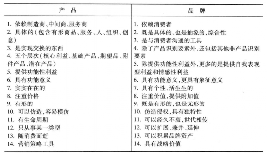 直到今天,品牌和产品应该被区分开来的观念才可以说被广泛接受(见表5-2)。而商界真正认识到这两个概念间的区别却花了很长时间。1955年,加德纳和列维在题为《产品与品牌》( The Product And The Brand)的文章中,第一次提出将产品与品牌区分开来。对这两个概念做出区分,有助于我们确定企业成功的原因。史蒂芬·金在其1973年出版的《开发新品牌》( Developing New Brands) -书中,明确强调了区分产品和品牌两个概念的重要性:“使企业成功的不是产品,而是品牌。”因此,品牌有时还被称为企业的“命根子”。朗哥斯瓦密( Rangaswamy)等在他们1993年的文章中,有以下一段文字,清楚地说明了成功的品牌战略对企业业绩的必要作用:“可口可乐公司的一位高级管理人员曾说,倘若该公司在灾难中失去了所有生产性资产,要筹措到足够资金重新建厂根本不是什么难事。然而,倘若所有消费者都突然失去了记忆,忘记了所有有关可口可乐的事情,那么可口可乐公司就将破产。正是可口可乐在消费者和商家心中树立起的美好形象,为可口可乐这一品牌创造了价值。”