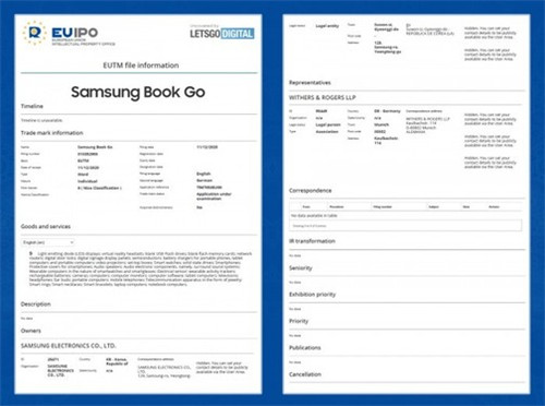 根据LetsGoDigital发布的信息表明,三星是在2020年12月11日正式向EUIPO(欧盟知识产权局)提出的商标申请,申请内容是将"Samsung Book Go "被归入第9类产品,这一类产品的描述为液晶显示器;平板电脑和便携式电脑;可穿戴式电脑;电脑显示器;平板电脑;便携式电脑;笔记本电脑;笔记本电脑。