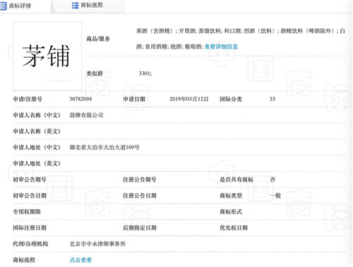 据悉,劲牌成立于1997年8月,经营范围包括酒类、保健食品生产和销售,纸品、塑料制品生产,食品添加剂生产、销售等。本案诉讼商标“茅铺”的申请注册人为劲牌,申请注册时间为2019年3月12日。而三个引证商标的申请注册人均为中国贵州茅台酒厂(集团)有限责任公司,申请注册时间为2010-2014年之间。