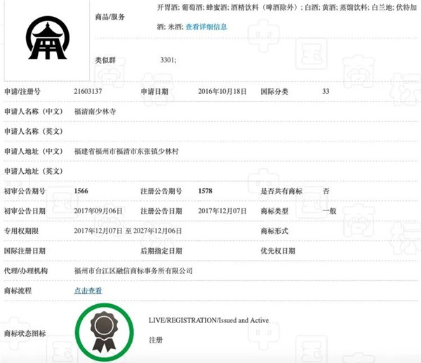 少林寺多个涉酒类商标,成功注册