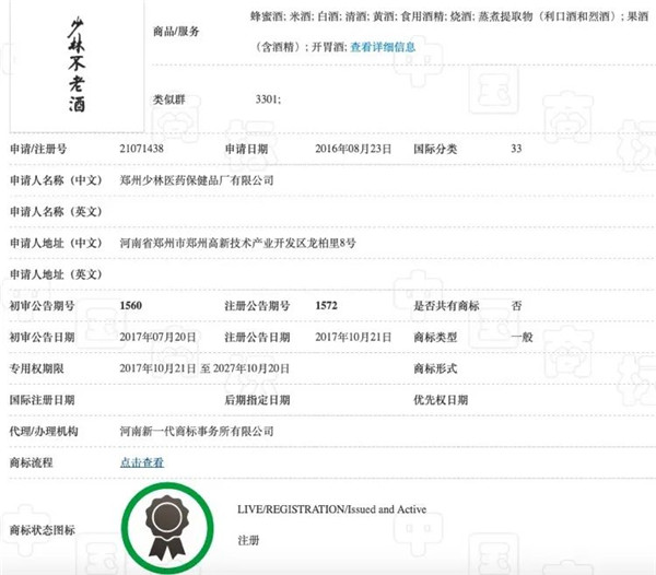 然而,在嵩山少林寺、福清南少林寺申请的33类酒类两个图形商标中,一个为僧人形象,一个为寺庙形象,均获得注册。另外,在郑州少林医药保健品厂有限公司于2016年8月23日申请的“少林不老酒”商标,为33类酒类商标,也获得注册。福清南少林寺注册的白酒类商标