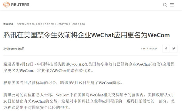 美国政府将从本月 20 日起禁止有关 WeChat 的各种交易和活动。而两位消息人士则对路透社表示:WeCom 并不在美国对 WeChat 相关交易禁令的范围内。