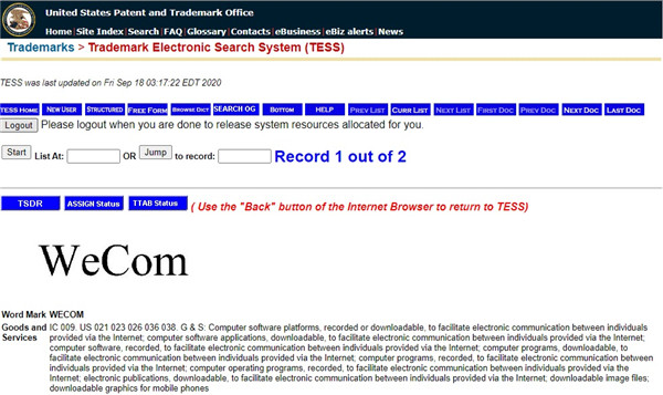 根据美国专利商标局的消息,腾讯已于 8 月 19 日注册了 WeCom 商标。对此消息,腾讯方面拒绝置评。另据腾讯公司的两位消息人士透露,WeCom 不在美国对微信相关交易禁令的范围内。