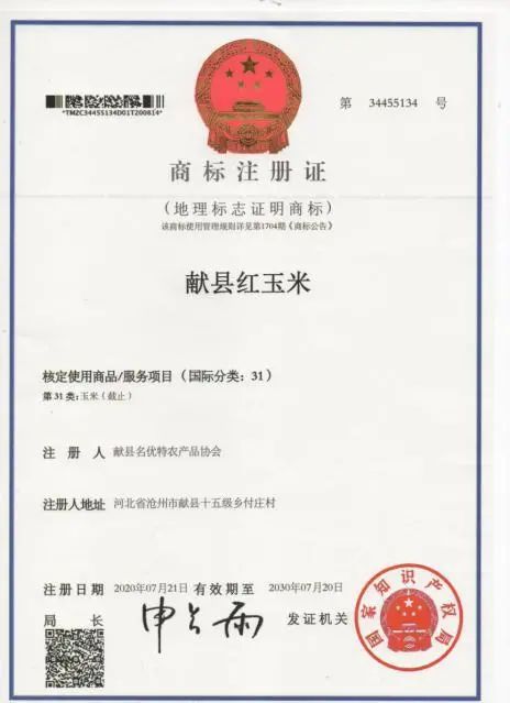 近日,从国家知识产权局传来喜讯,由献县市场监督管理局牵头指导申报的献县首例国家地理标志证明商标“献县红玉米”注册成功!献县红玉米是沧州市献县的特产农副产品之一,已有20多年的种植历史,所产的红玉米中含有丰富的蛋白质、硒、镁等,由于口感好,深受当地人民的喜爱,如今献县红玉米产品畅销河北省内外。