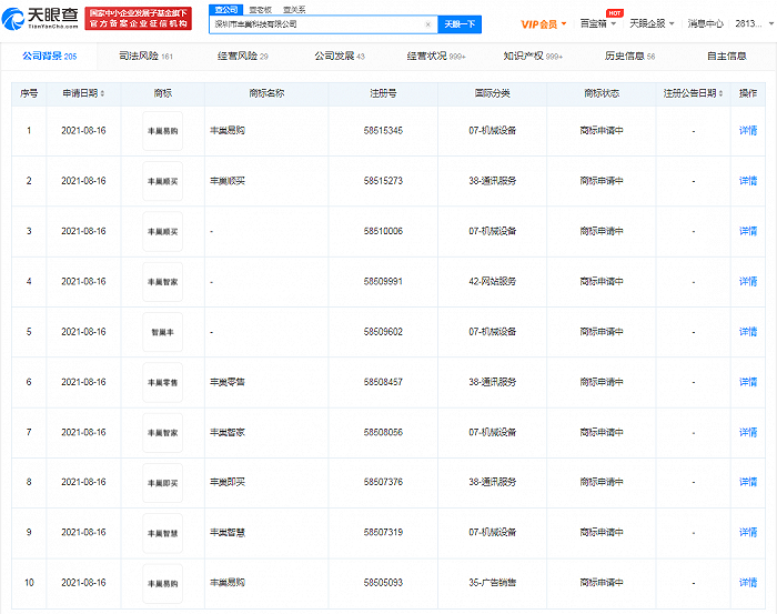 据天眼查APP显示,8月16日,深圳市丰巢科技有限公司申请注册多项“丰巢易购”商标,国际分类涉及网站服务、通讯服务等,目前商标状态均为申请中。