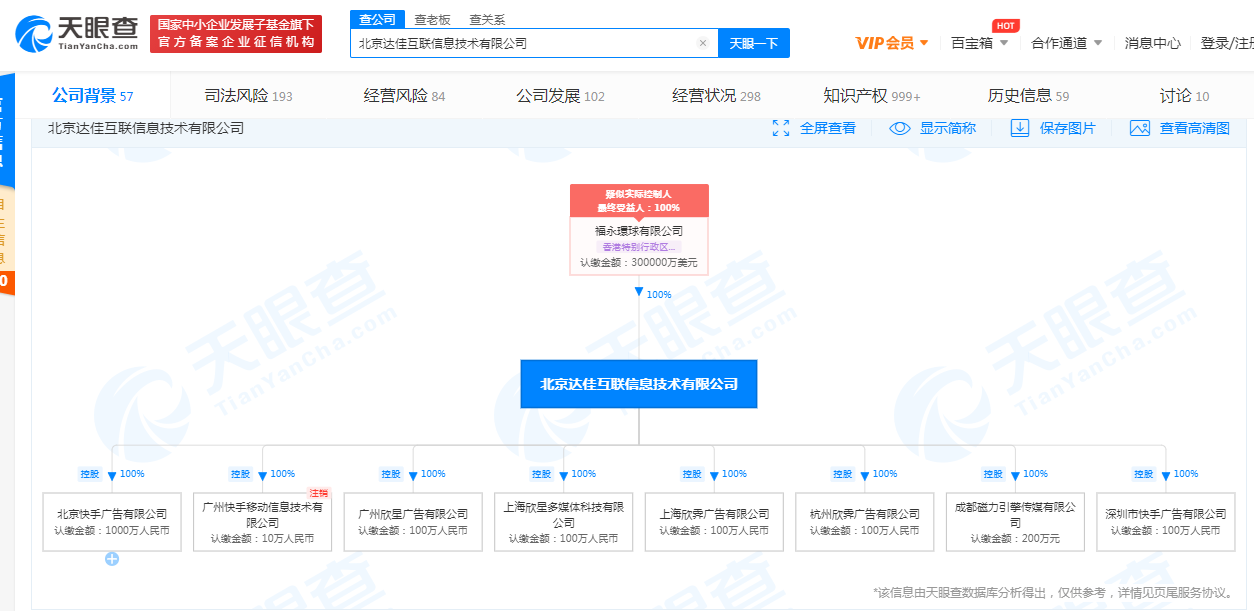 此外,根据天眼查资料,北京达佳互联信息技术有限公司成立于2014年7月,注册资本30亿美元,法定代表人为杨远熙。股权穿透图显示,该公司对北京快手广告有限公司、广州快手移动信息技术有限公司、深圳市快手广告有限公司、成都磁力引擎传媒有限公司等多个公司持股100%。