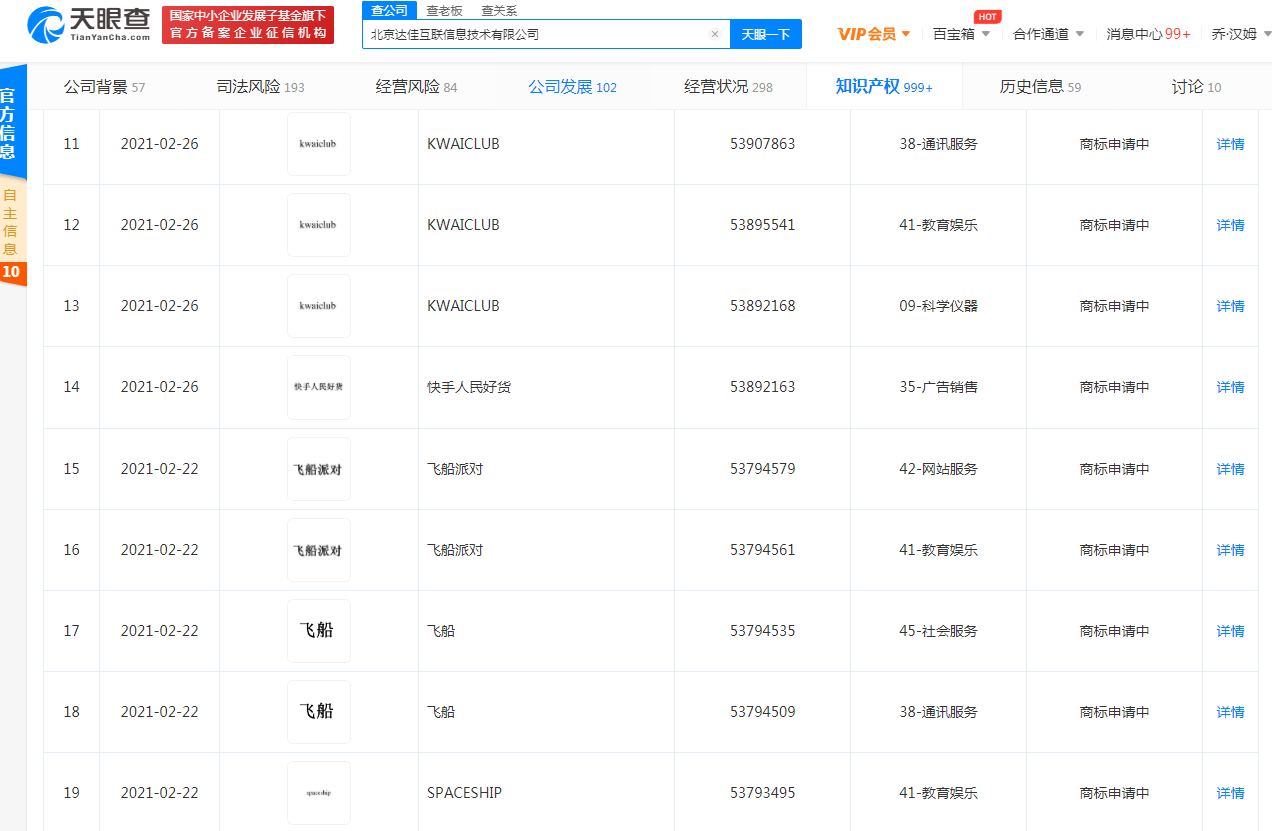 此前2月22日,该公司申请注册“飞船”、“飞船派对”商标,国际分类涉及网站服务、教育娱乐、通讯服务、广告销售等,状态均为“商标申请中”。同时,2月26日,还申请注册多个“KWAICLUB”和“快手人民好货”商标,涉及通讯服务、教育娱乐、广告销售等,状态均为“商标申请中”。